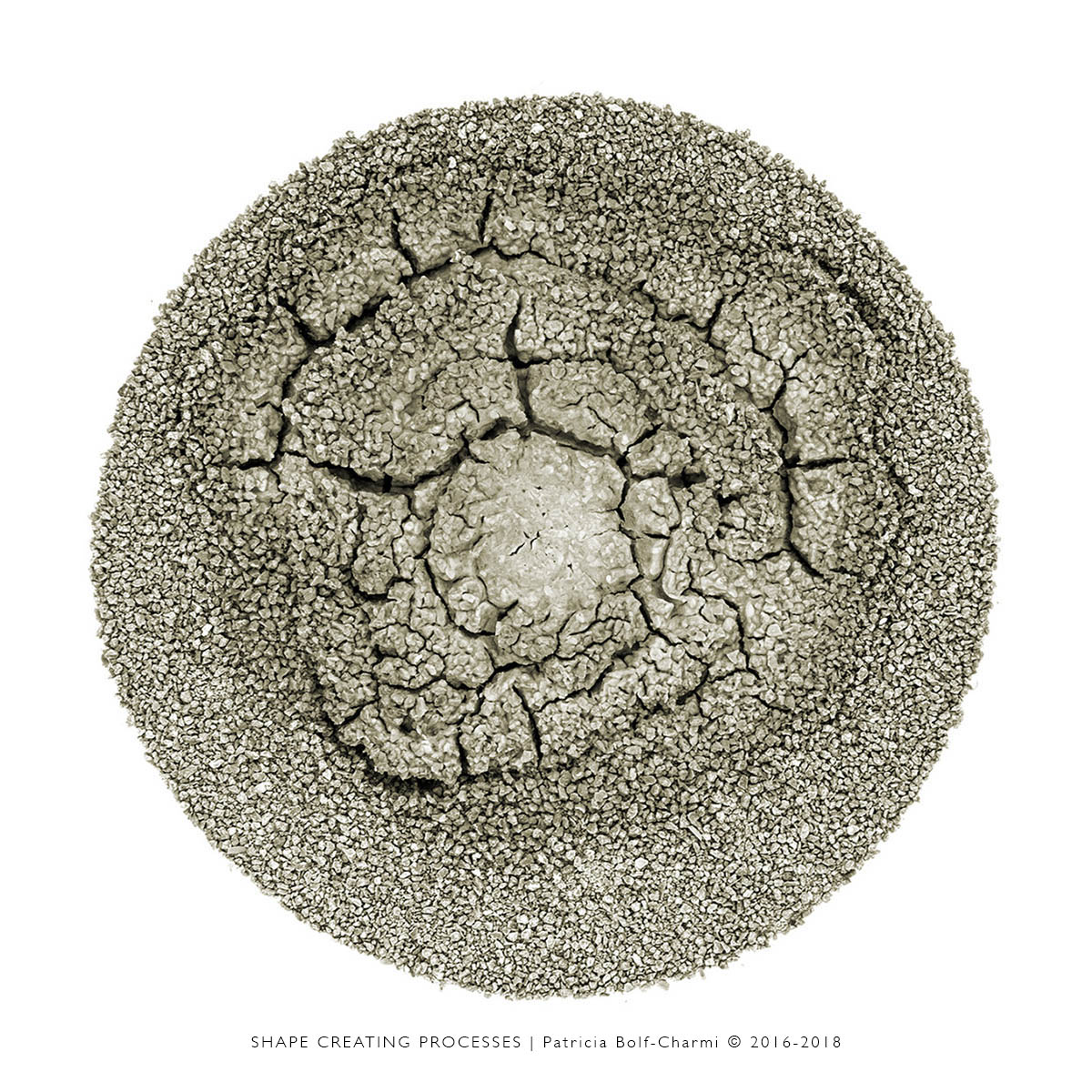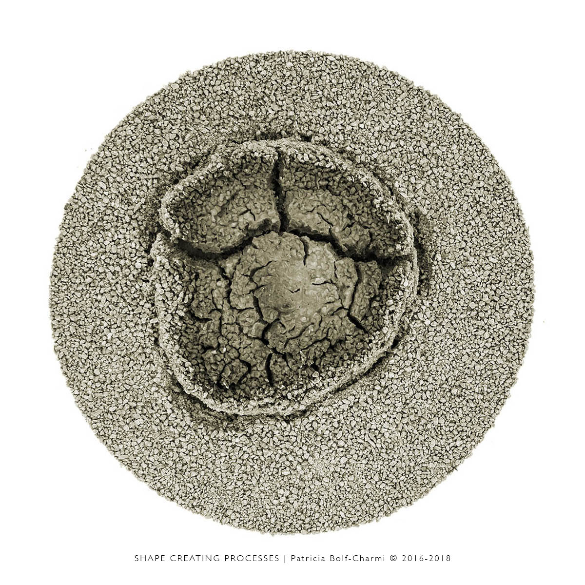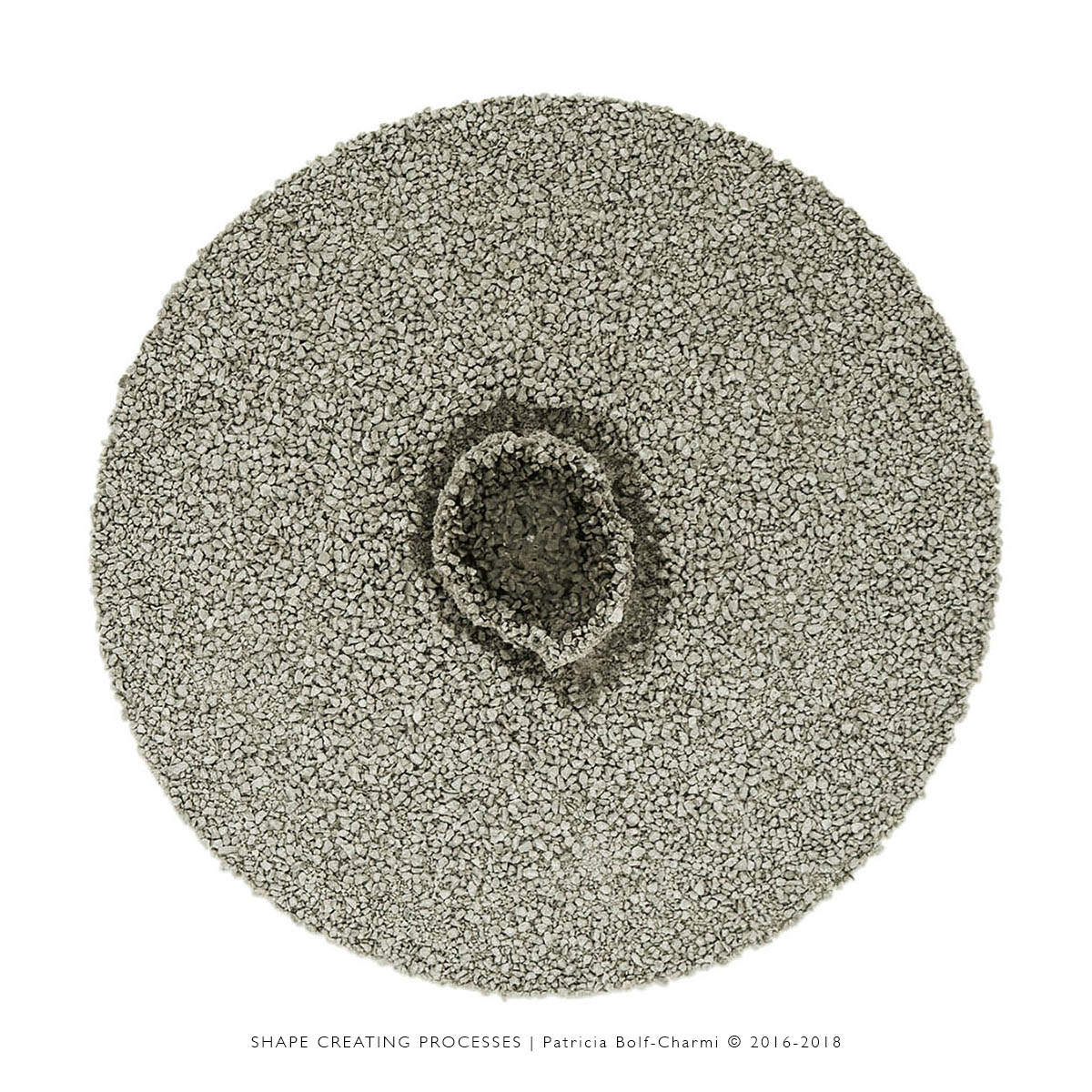 The shape creating process is induced by the continuous, dropwise increasing effect of water on the sedimentary rock (bentonite) in the dry state to the wet state in several intervals. This self-organized, relief-forming process is a scheme of geomorphological processes.